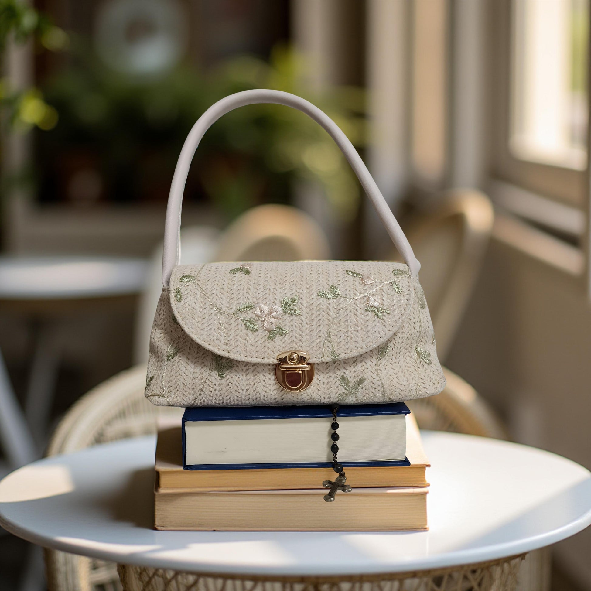 Voici un ravissant sac à main beige orné d'une délicate broderie florale. Son tissu texturé lui confère un aspect doux et chaleureux, tandis que sa poignée blanche incurvée ajoute une touche d'élégance. Doté d'un fermoir classique doré, ce sac dégage un charme romantique d'inspiration vintage, idéal pour une tenue raffinée au quotidien ou une promenade printanière.